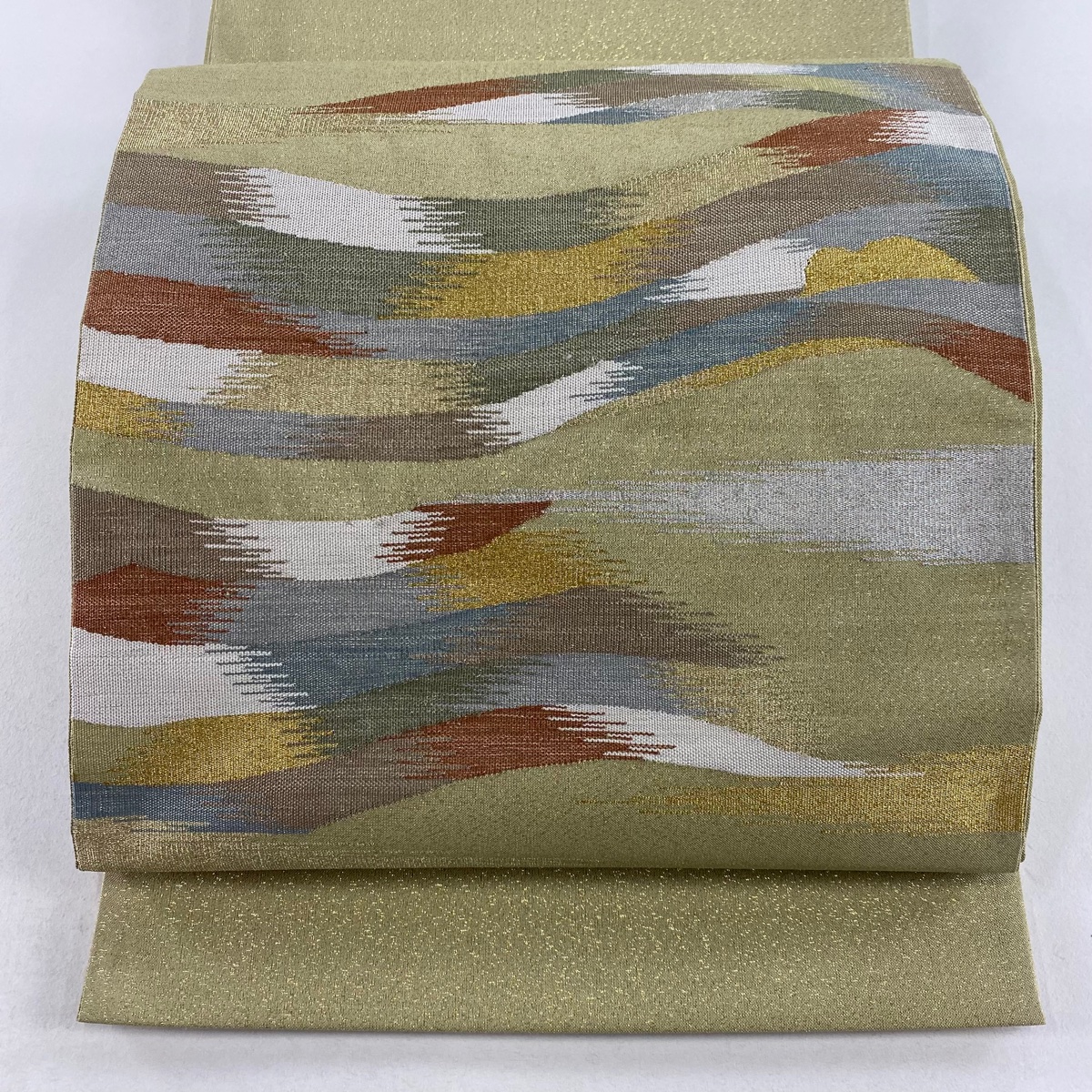 袋帯 美品 秀品 幾何学 霞 金銀糸 よもぎ色 お太鼓柄 正絹 中古 在庫一掃