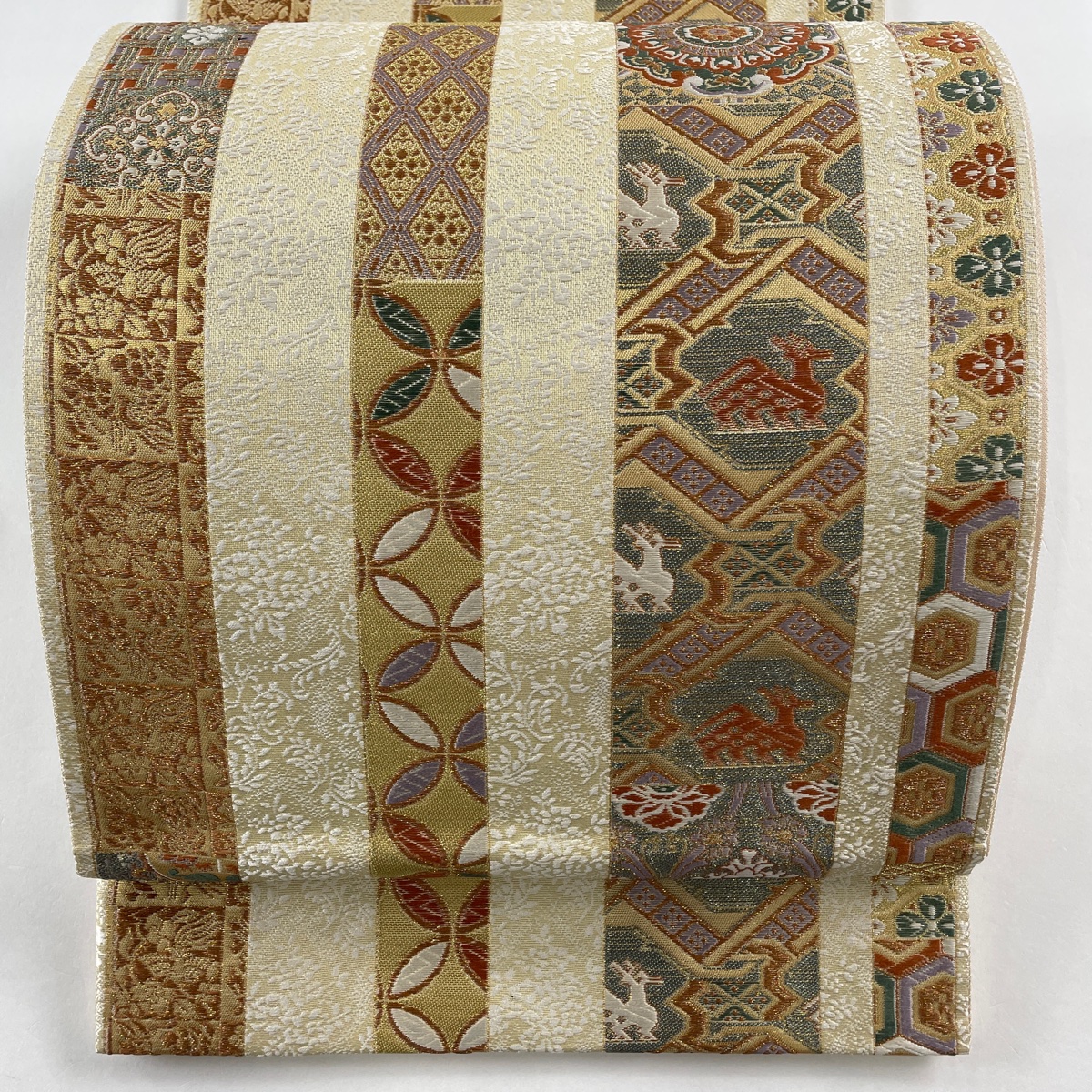 袋帯 美品 秀品 有栖川文 草花 刺繍 箔 ベージュ 六通 正絹 中古 在庫一掃