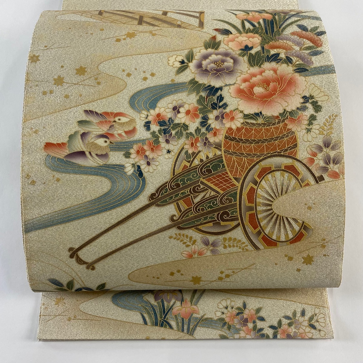 袋帯 秀品 花車 花鳥 金彩 銀糸 クリーム お太鼓柄 正絹 中古 在庫一掃