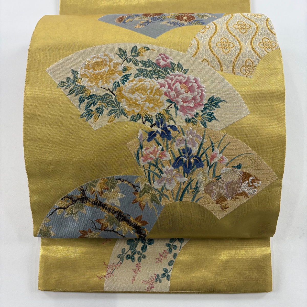 袋帯 美品 秀品 証紙あり 扇面 立涌 金銀糸 箔 金色 六通 正絹 中古 在庫一掃