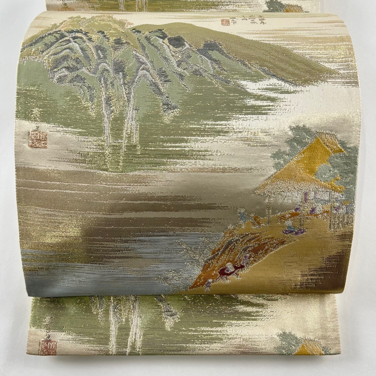 袋帯 美品 秀品 漢方染 山並み 人物 箔 ベージュ 六通 正絹 中古 在庫一掃