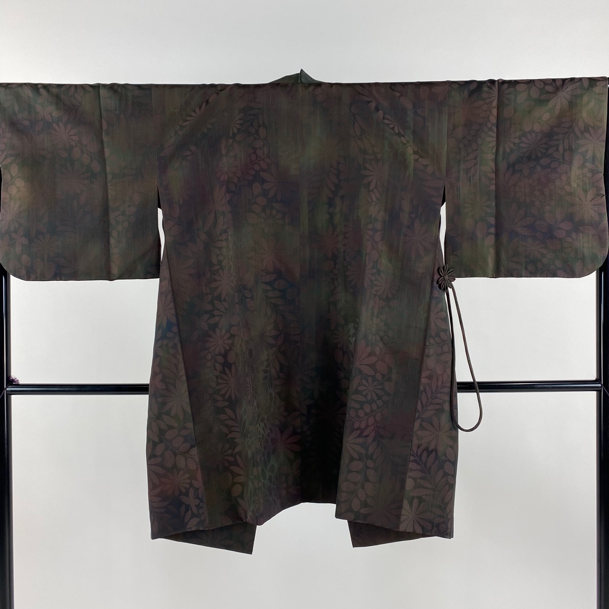 道中着 身丈96cm 裄丈66cm M 和装コート 着物衿 草花 焦茶色 正絹 美品 逸品 中古 在庫一掃