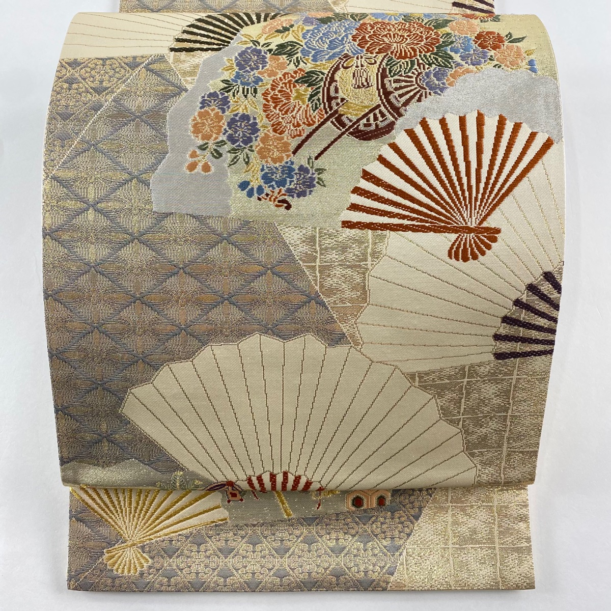 袋帯 秀品 吉祥宝づくし 扇 花車 箔 金銀糸 金色 六通 正絹 中古 在庫一掃