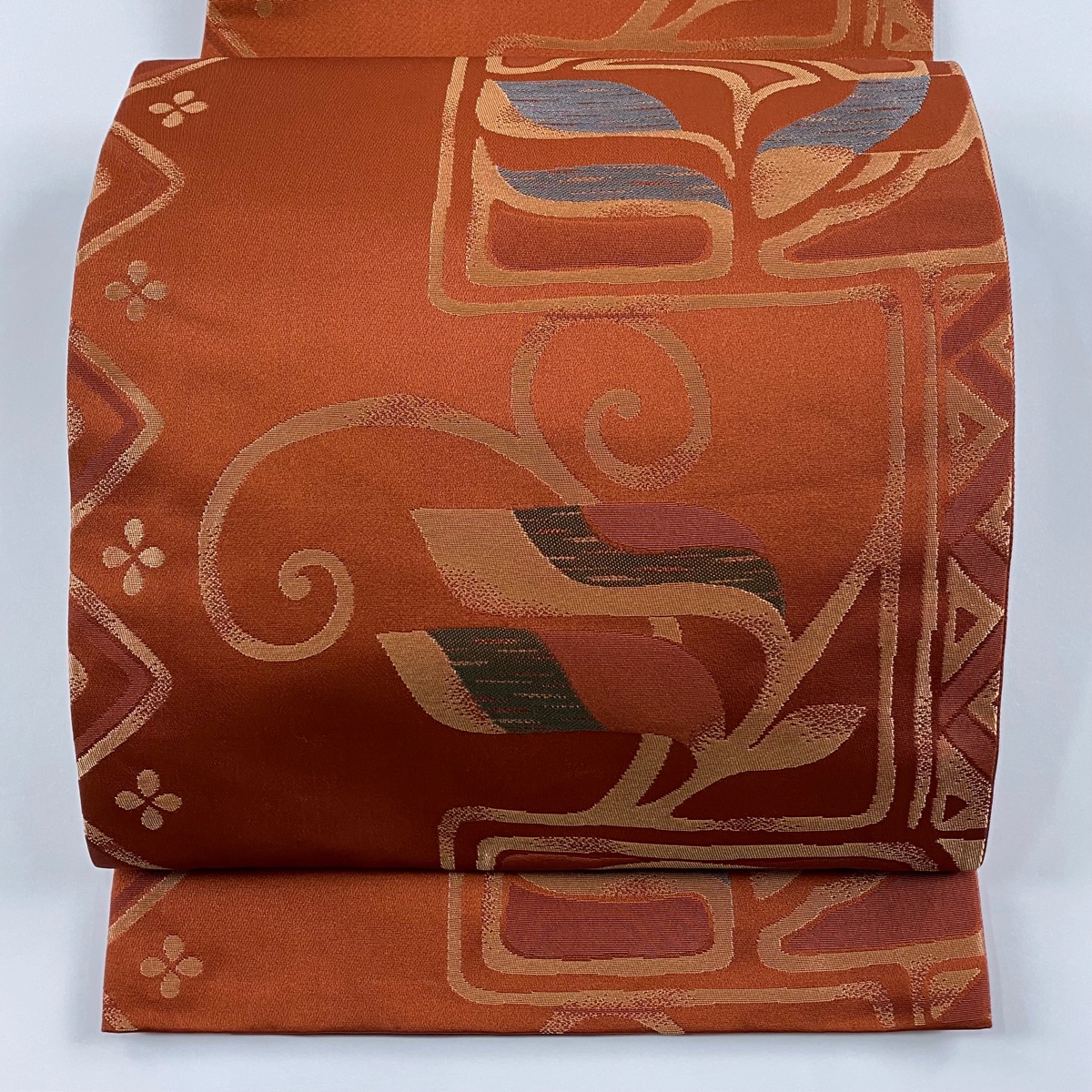 袋名古屋帯 美品 優品 唐草 花 赤茶 化繊 中古 在庫一掃