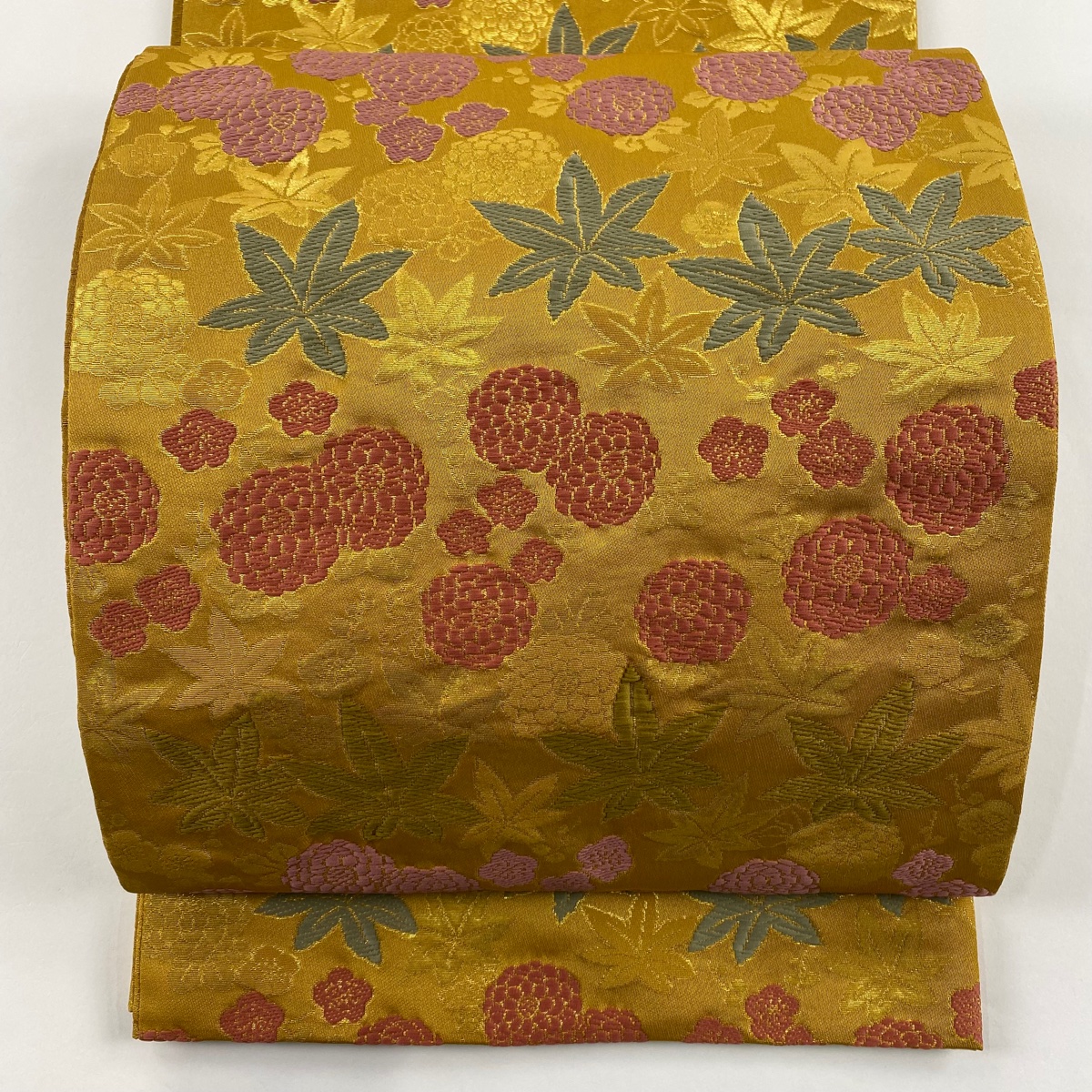 袋名古屋帯 美品 優品 菊 楓 箔 黄土色 化繊 中古 在庫一掃