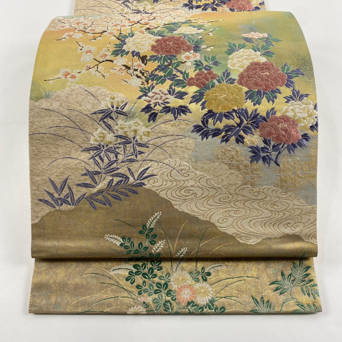 袋帯 秀品 牡丹 枝梅 唐織 箔 金色 六通 正絹 中古 在庫一掃