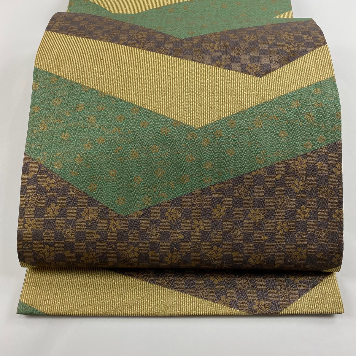 袋帯 秀品 桜 竹縞 金彩 薄緑 全通 正絹 中古 在庫一掃