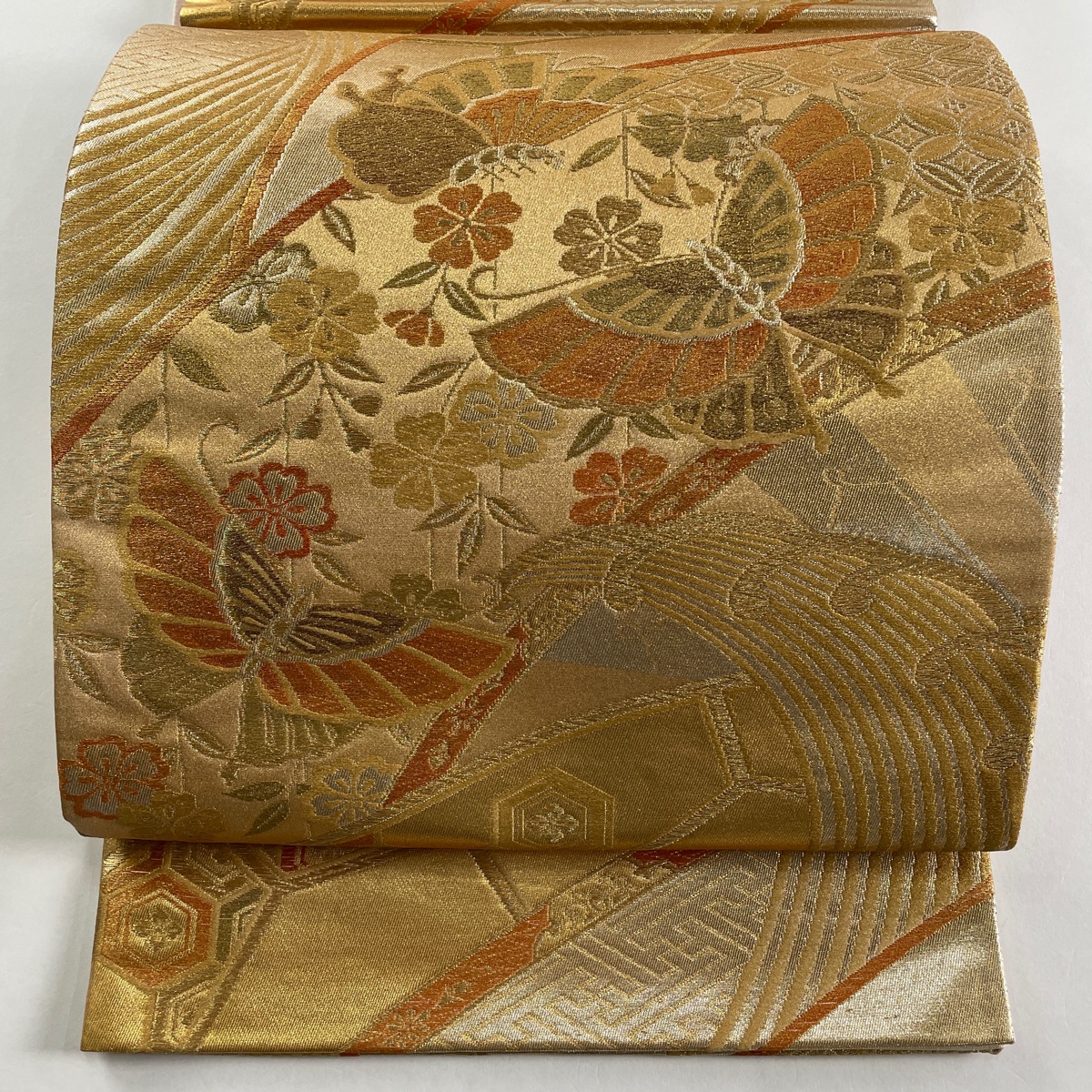 袋帯 秀品 蝶 桜 箔 金糸 金色 六通 正絹 中古 在庫一掃