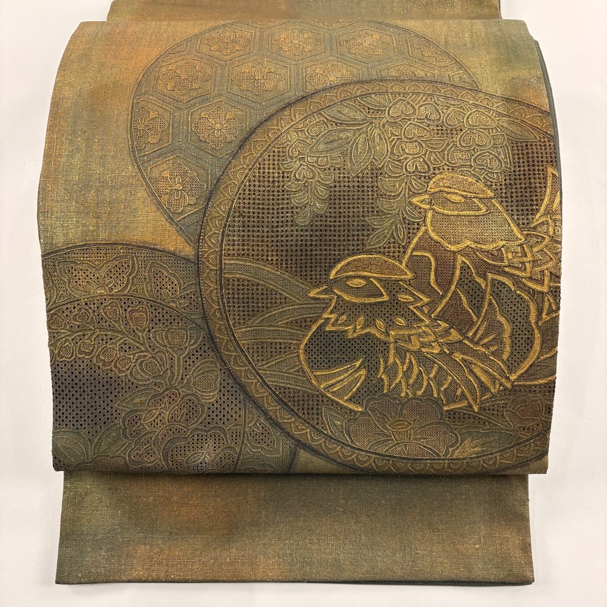 袋帯 秀品 鴛鴦 草花 刺繍 金彩 金色 お太鼓柄 正絹 中古 在庫一掃