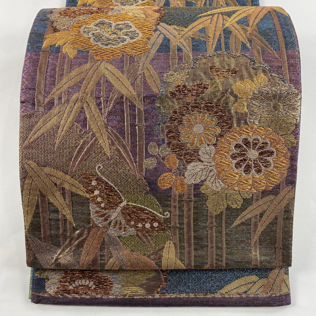 袋帯 秀品 関西仕立て 雪輪 草花 金糸 箔 青 六通 正絹 中古 在庫一掃