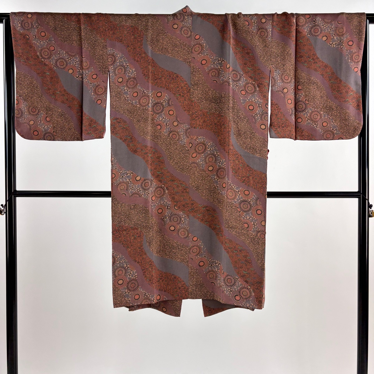 美品 道中着 身丈108cm 裄丈66.5cm M 落款あり 菊唐草 松竹梅 縮緬 小豆色 正絹 名品 中古