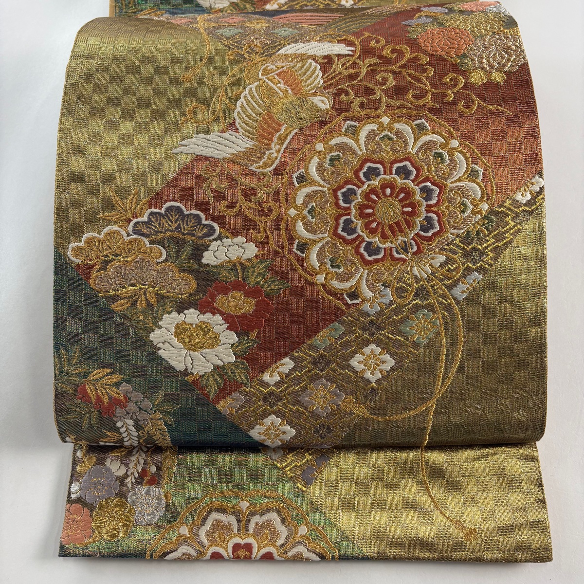 袋帯 秀品 鏡裏文 花鳥 刺繍 金銀糸 金色 六通 正絹 中古 在庫一掃