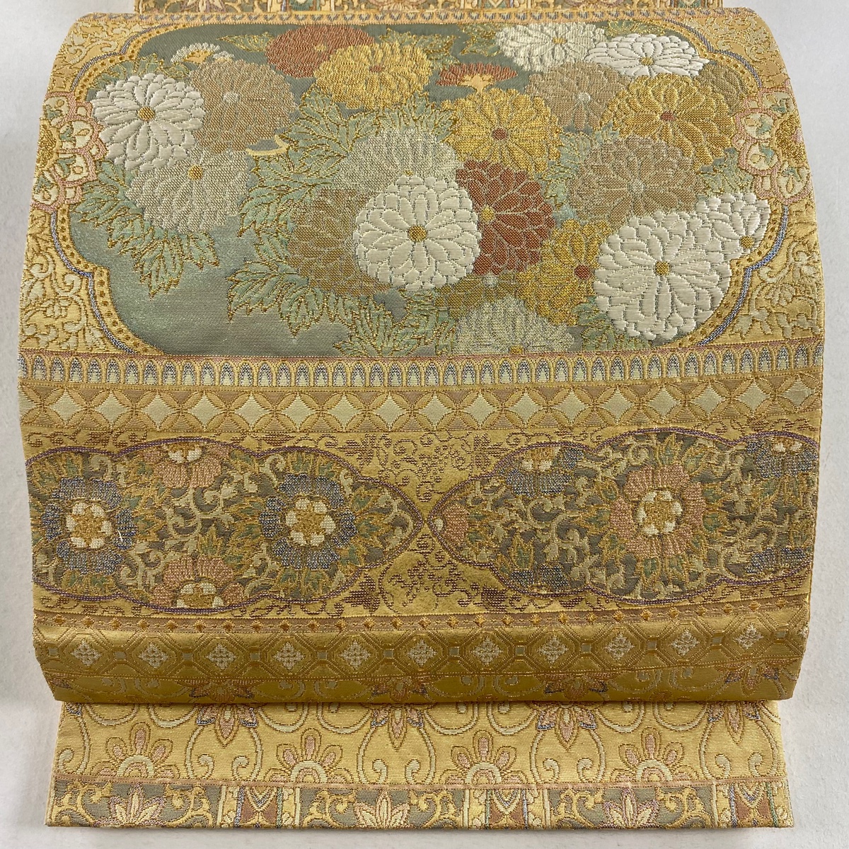 袋帯 秀品 横段菊華紋 金銀糸 刺繍 金色 六通 正絹 中古 在庫一掃