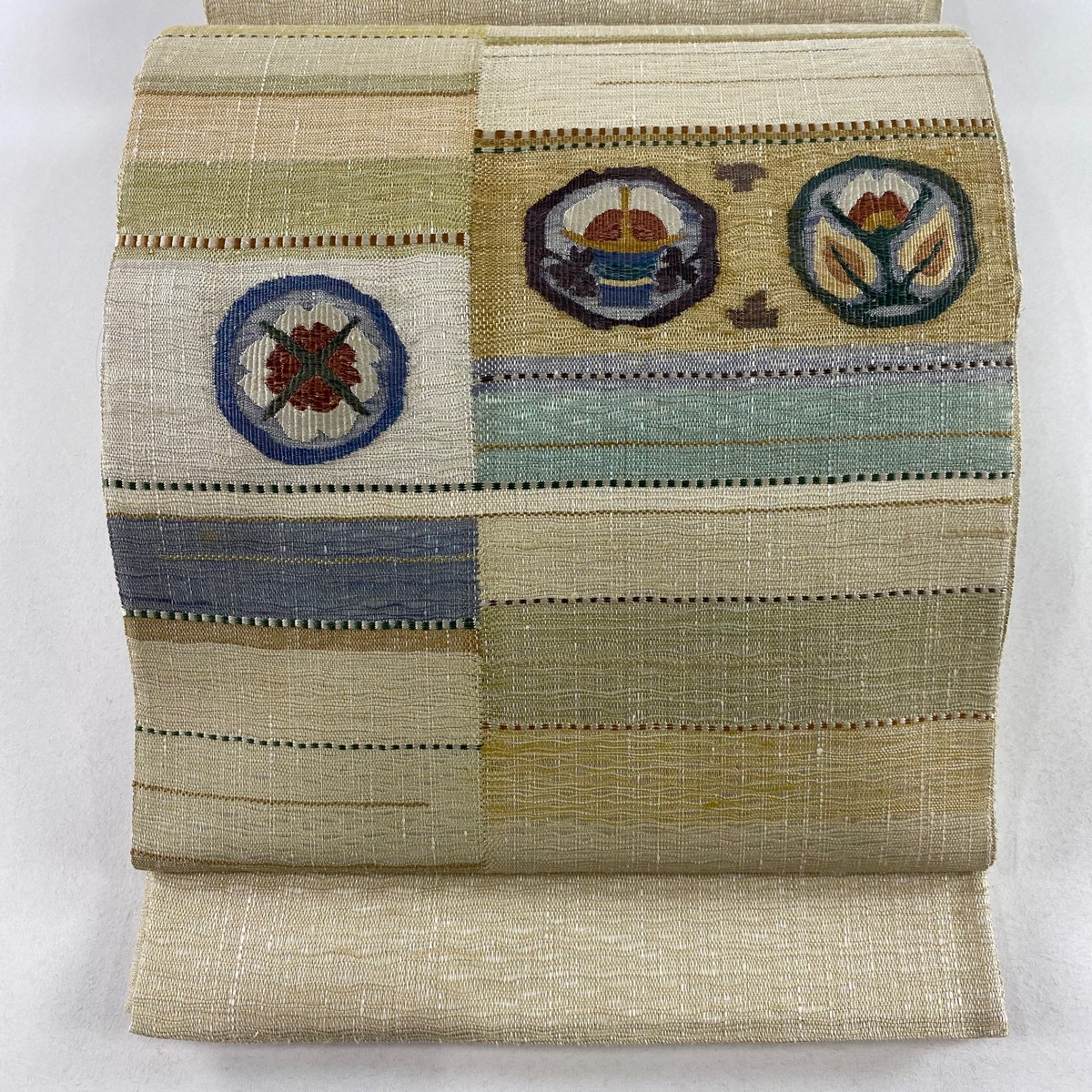 袋帯 秀品 草花 幾何学 ベージュ お太鼓柄 正絹 中古 在庫一掃
