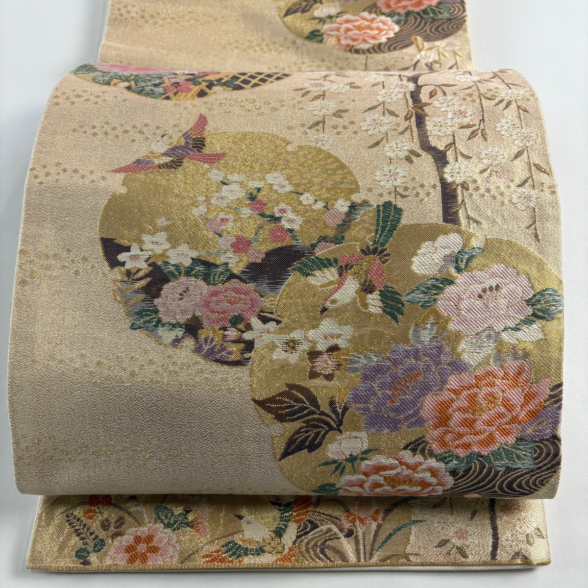 袋帯 秀品 関西仕立て 雪輪 花鳥 金糸 箔 金色 六通 正絹 中古 在庫一掃