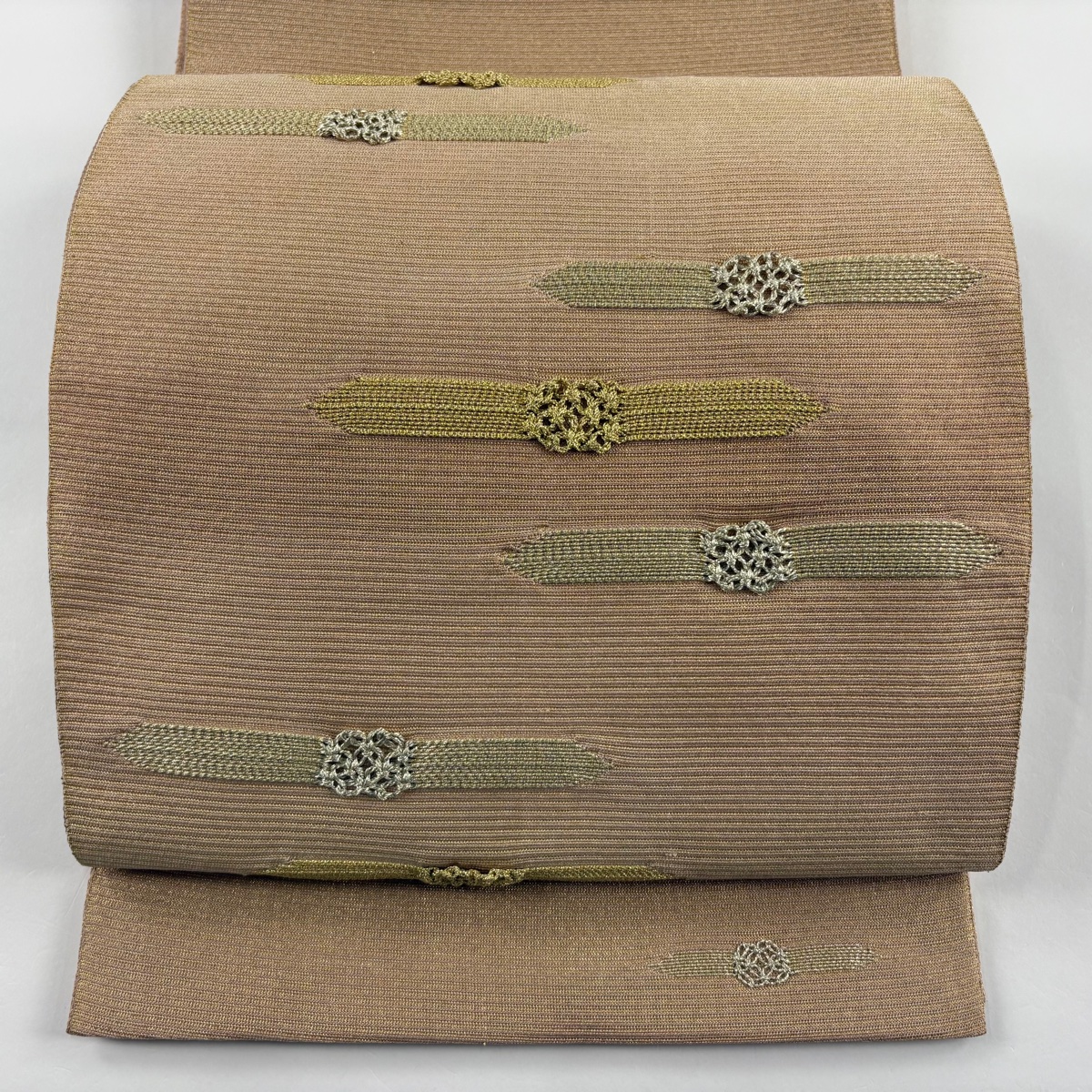 袋帯 秀品 幾何学模様 金糸 金通し 薄オレンジ お太鼓柄 正絹 中古 在庫一掃