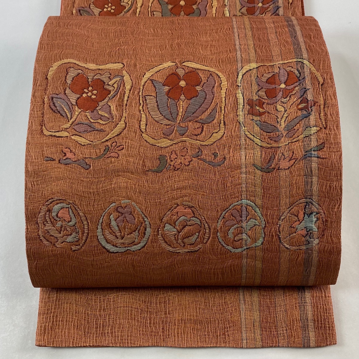 袋帯 秀品 草花 縞 箔 オレンジ 六通 正絹 中古 在庫一掃