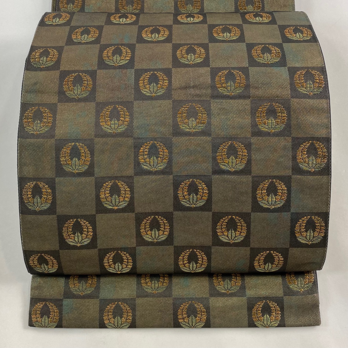 袋帯 秀品 市松 藤 金糸 箔 金色 六通 正絹 中古 在庫一掃