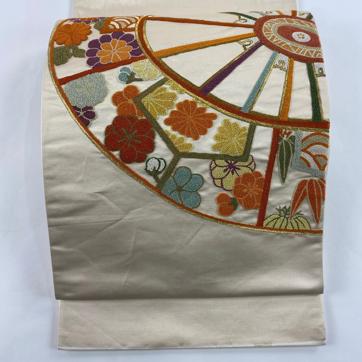 袋帯 秀品 関西仕立て 番傘 草花 相良刺繍 金糸 ベージュ お太鼓柄 正絹 中古 在庫一掃