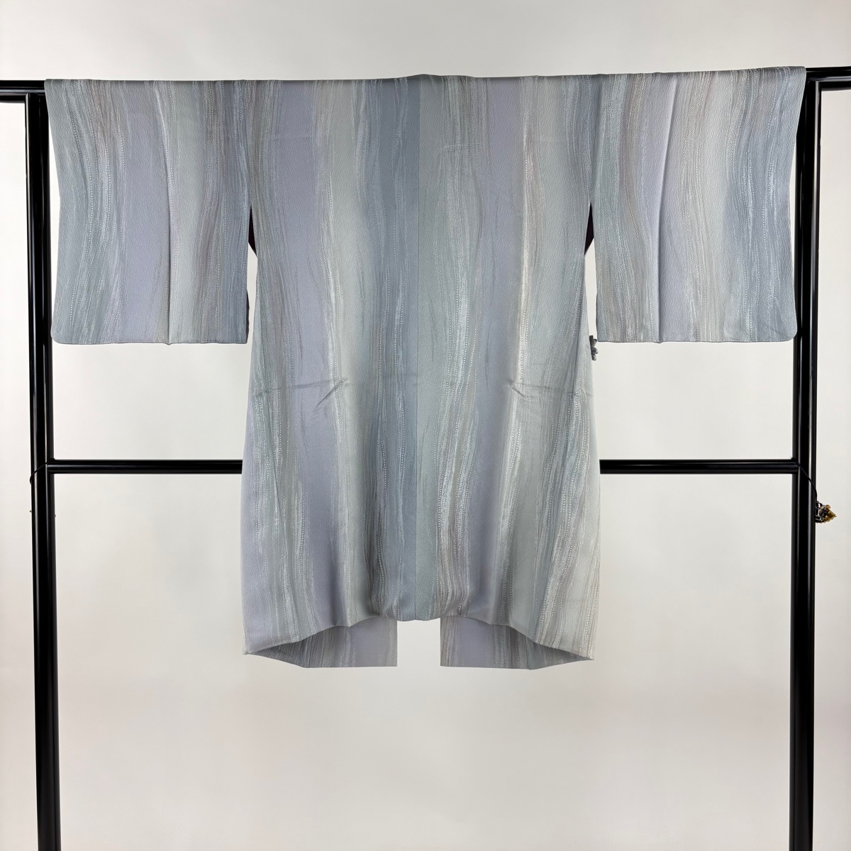 美品 道中着 身丈96cm 裄丈63cm S 和装コート よろけ縞 縦ぼかし 青灰色 正絹 名品 中古