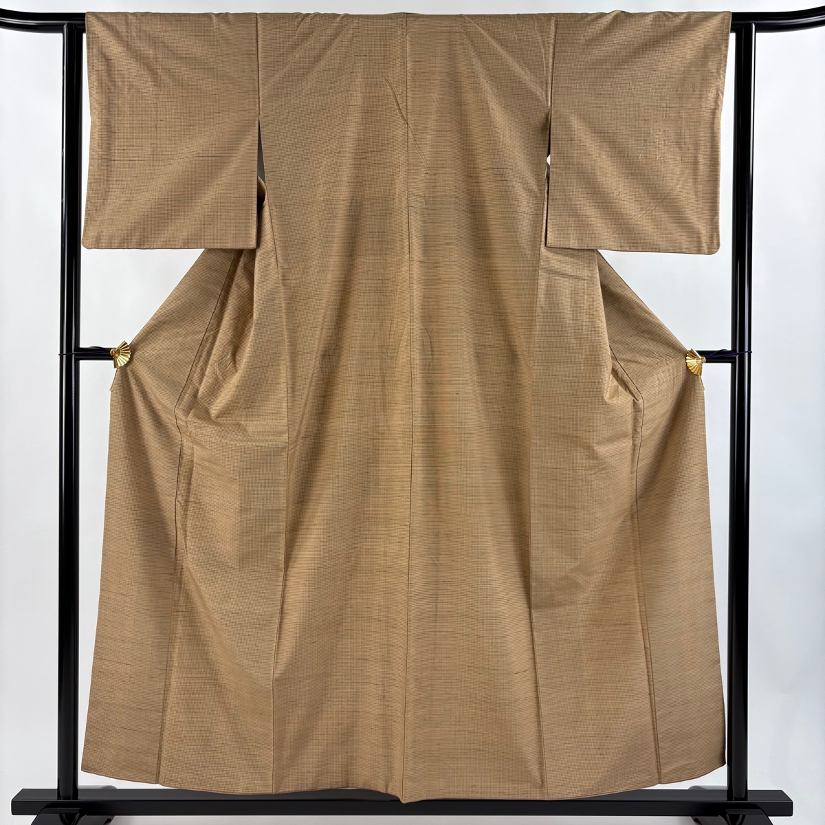 紬 身丈156cm 裄丈62cm S 袷 格子柄 薄茶色 正絹 秀品 中古 在庫一掃