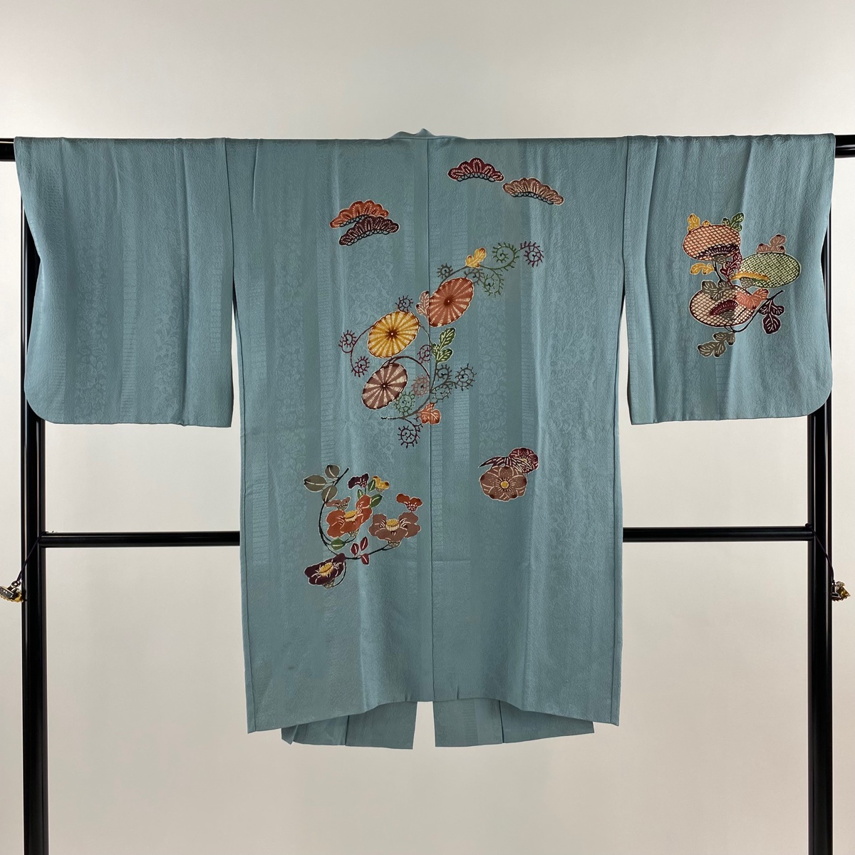 道中着 身丈97.5cm 裄丈68cm L 和装コート 花唐草 水色 正絹 秀品 中古