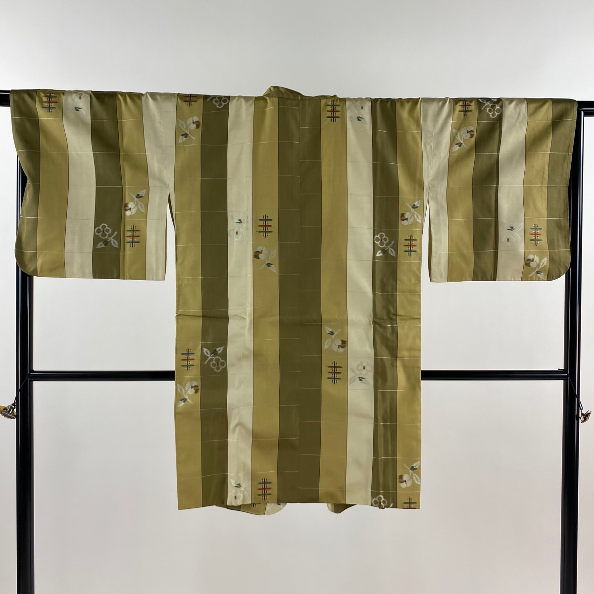 道中着 身丈97.5cm 裄丈67.5cm L 和装コート 紬地 着物衿 草花 幾何学模様 鶯色 正絹 秀品 中古