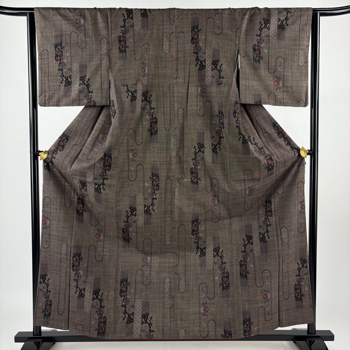 美品 紬 身丈160cm 裄丈63cm S 袷 草花 亀甲 焦茶色 正絹 秀品 中古 在庫一掃