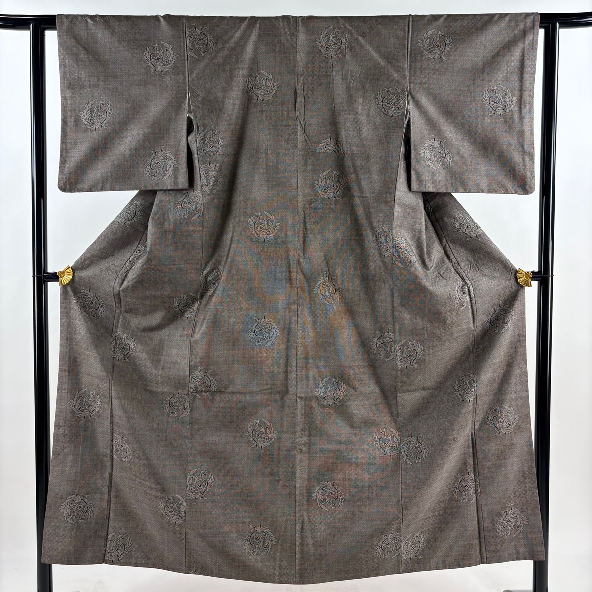 紬 身丈151cm 裄丈61cm S 袷 ますいわ屋 鳳凰 幾何学 焦茶色 正絹 秀品 中古 在庫一掃