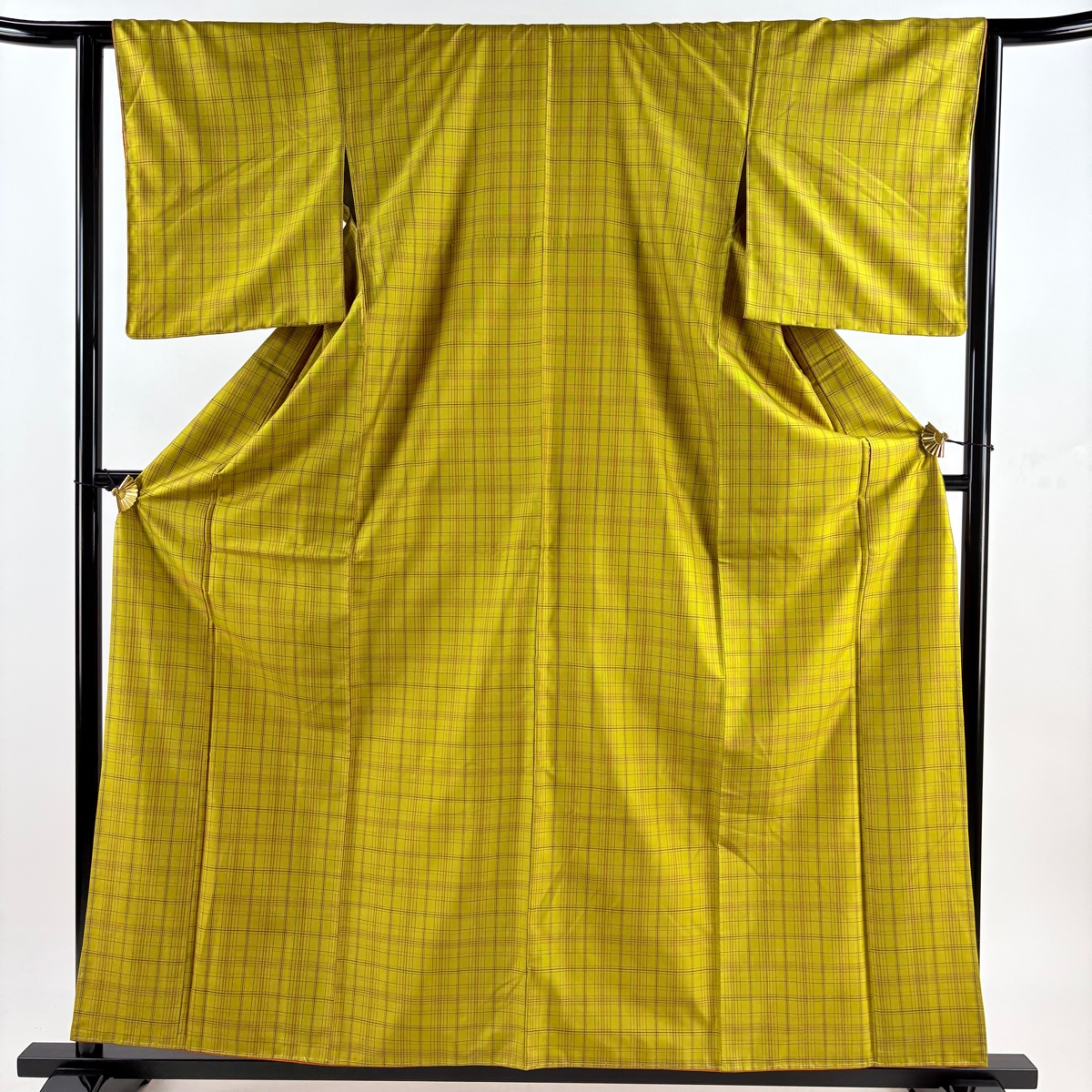 美品 紬 身丈159cm 裄丈63cm S 袷 格子 からし色 正絹 秀品 中古 在庫一掃