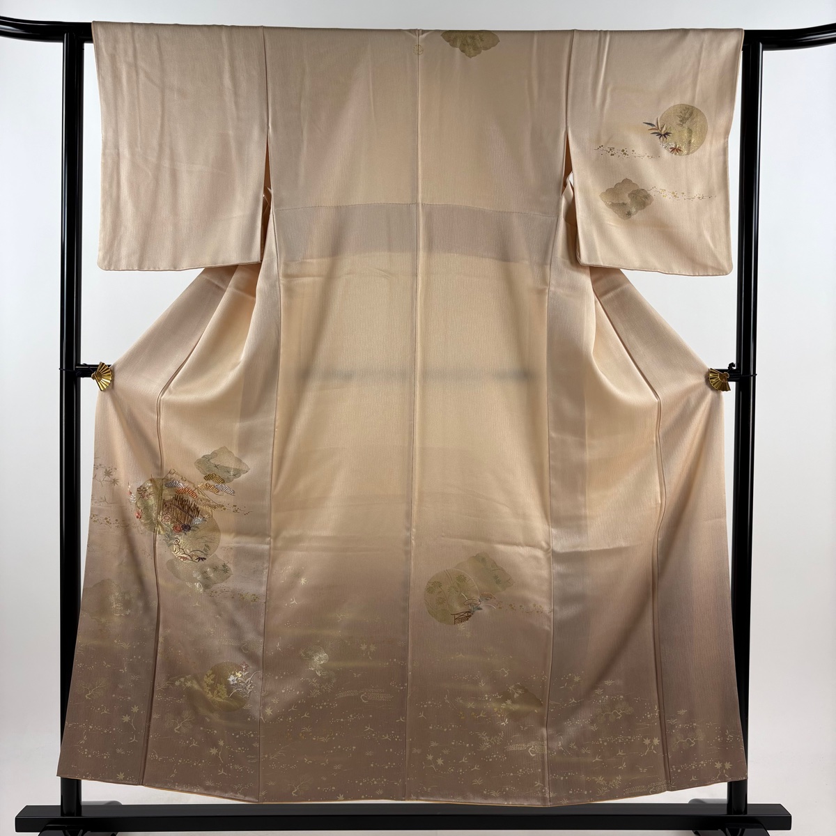 付下げ 身丈154.5cm 裄丈61.5cm S 袷 松竹梅 家屋 刺繍 金彩 薄オレンジ 正絹 秀品 一つ紋 中古 在庫一掃