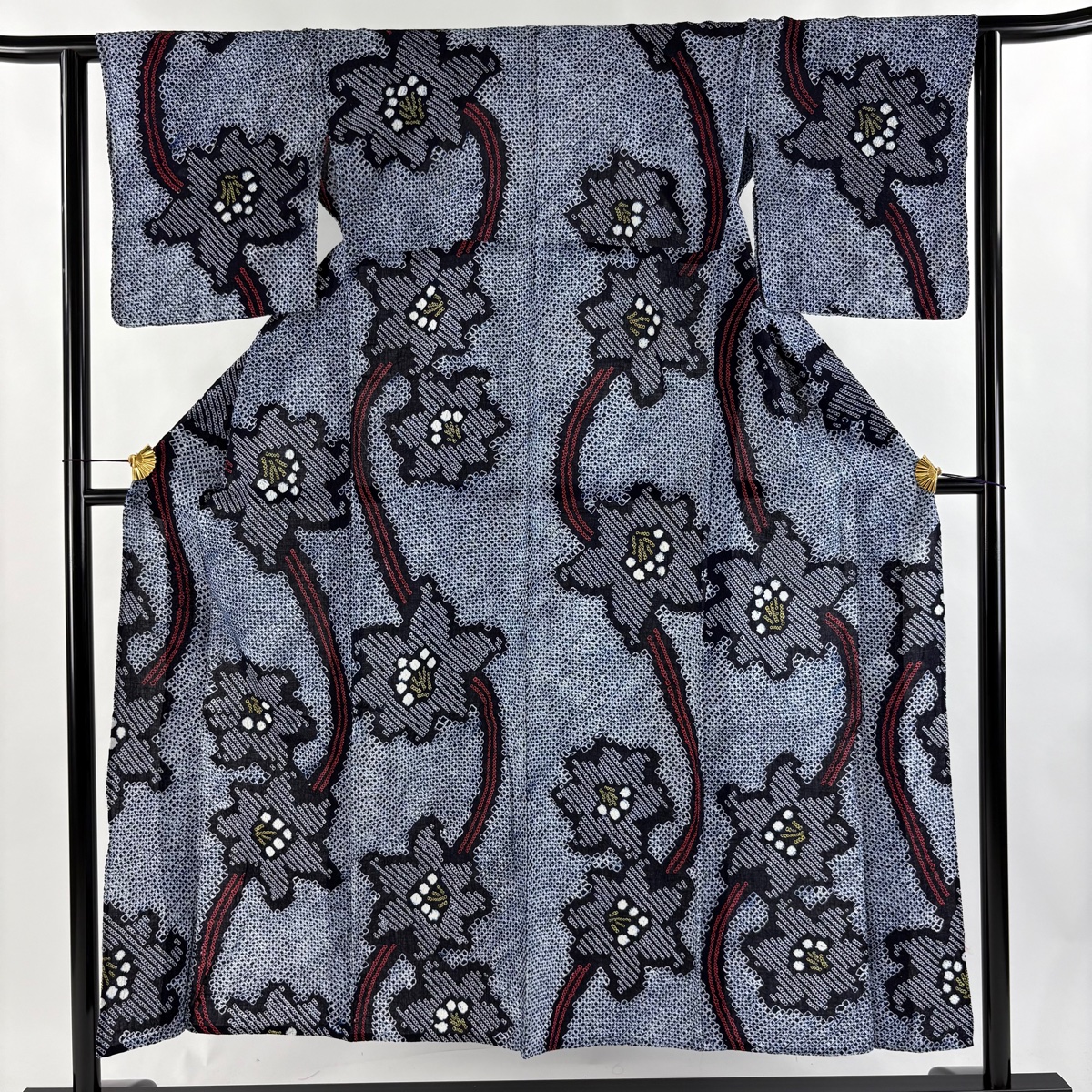 浴衣 身丈150cm 裄丈62.5cm S 絞り浴衣 草花 紺色 綿 名品 中古 在庫一掃