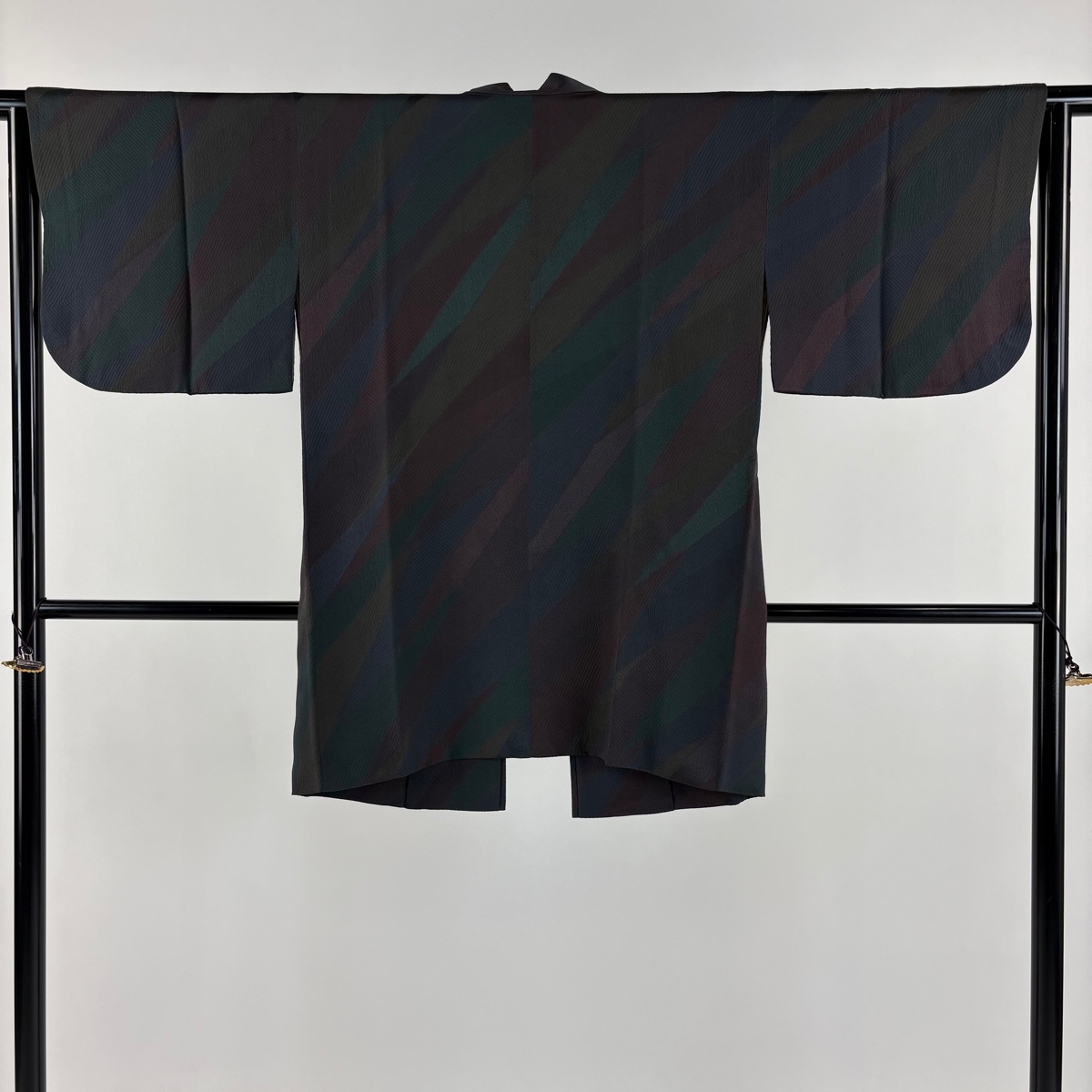 美品 道中着 身丈84.5cm 裄丈63.5cm S 和装コート 斜縞 地紋 茶紫 正絹 秀品 中古