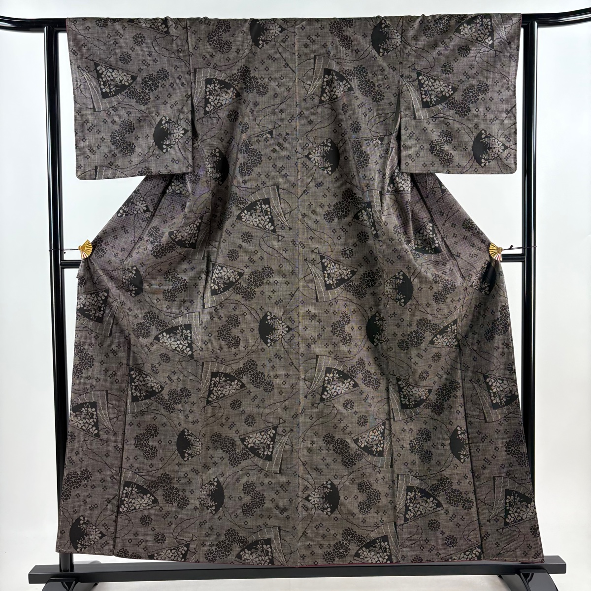 美品 紬 身丈157cm 裄丈61.5cm S 袷 扇 菊 焦茶色 正絹 秀品 中古 在庫一掃