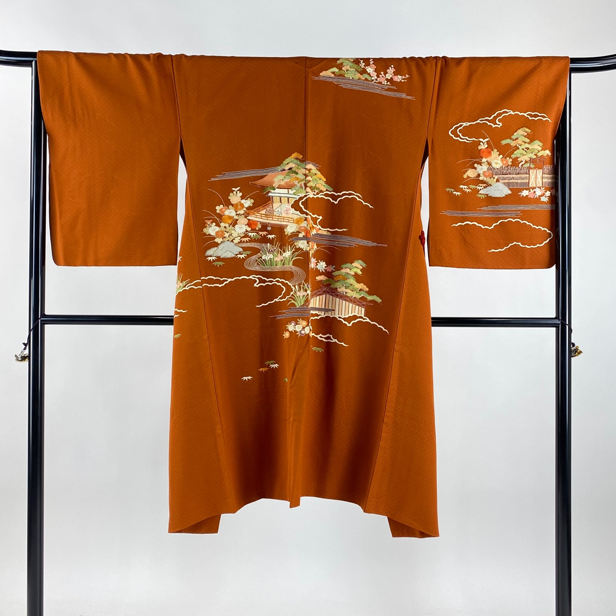 道中着 身丈115.5cm 裄丈67cm M 和装コート 菊 流水 刺繍 金彩 赤茶 正絹 名品 中古