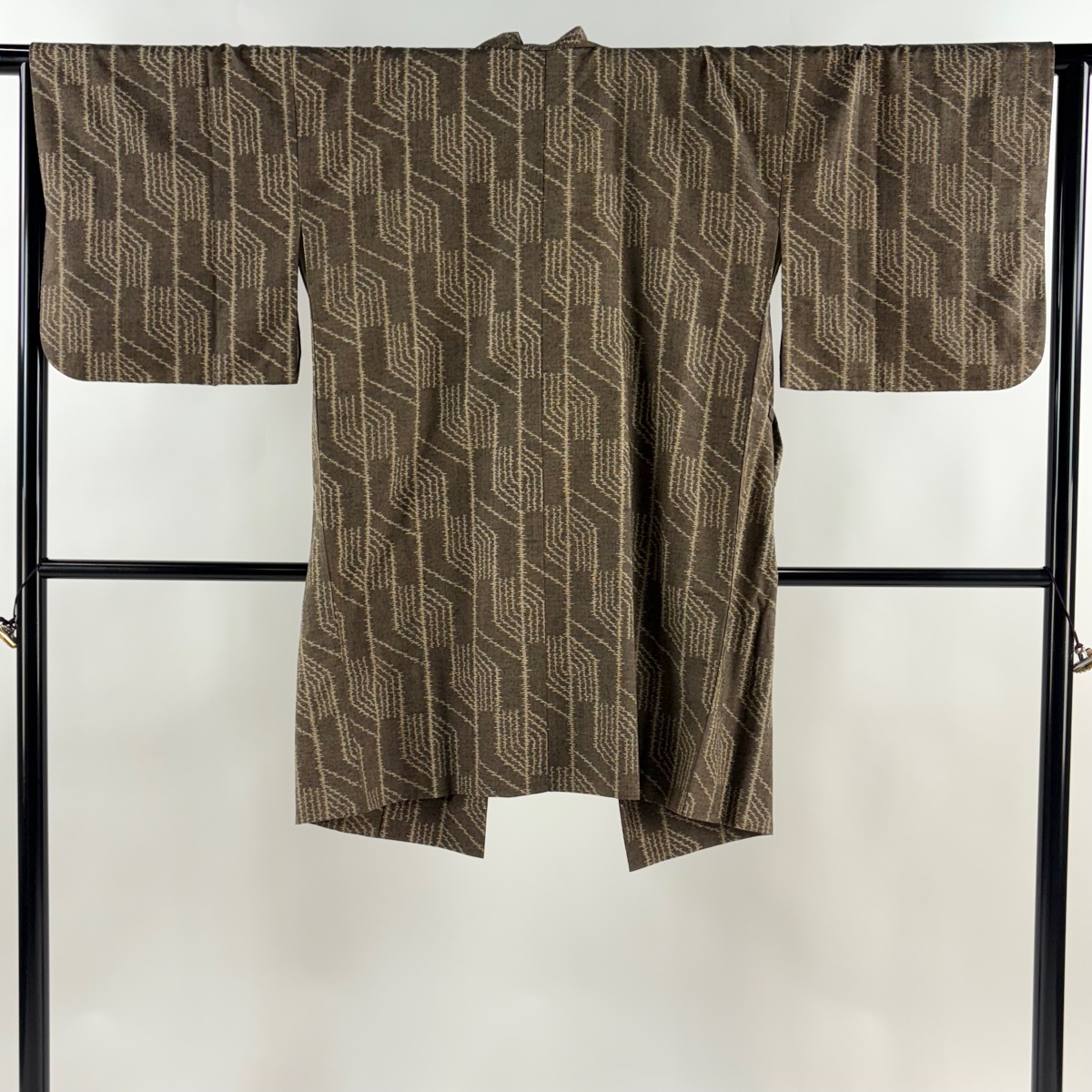 道中着 身丈98.5cm 裄丈65cm M 和装コート 着物衿 幾何学模様 茶色 正絹 秀品 中古