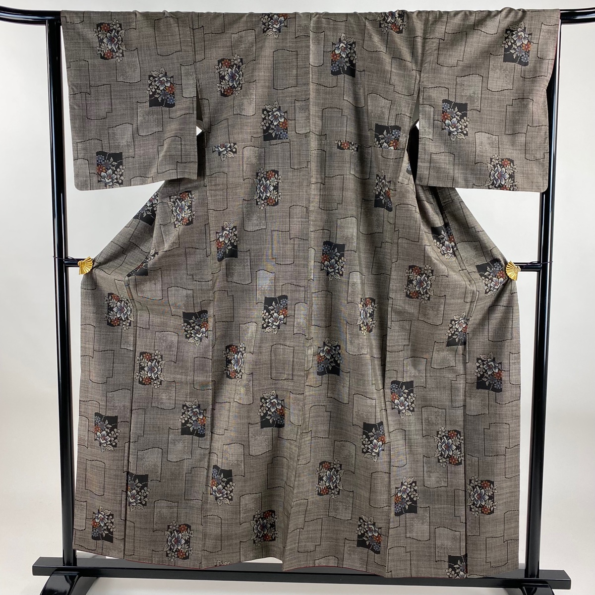 美品 紬 身丈157cm 裄丈65cm M 袷 草花 幾何学 焦茶色 正絹 秀品 中古 在庫一掃