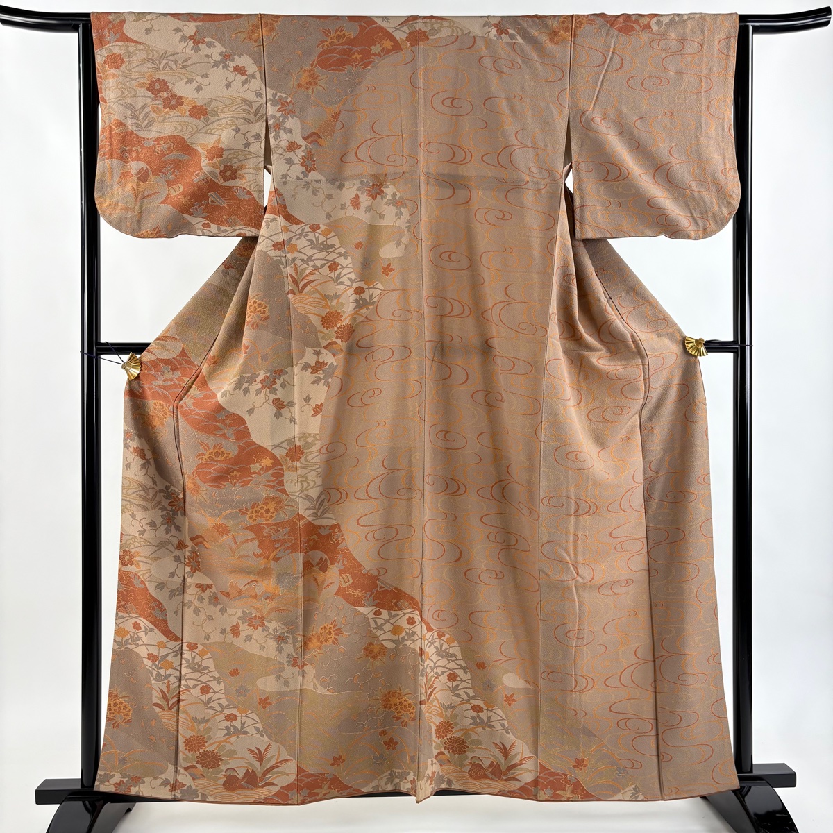 訪問着 身丈158.5cm 裄丈63cm S 袷 草花 鴛鴦 金彩 茶色 正絹 秀品 中古 在庫一掃