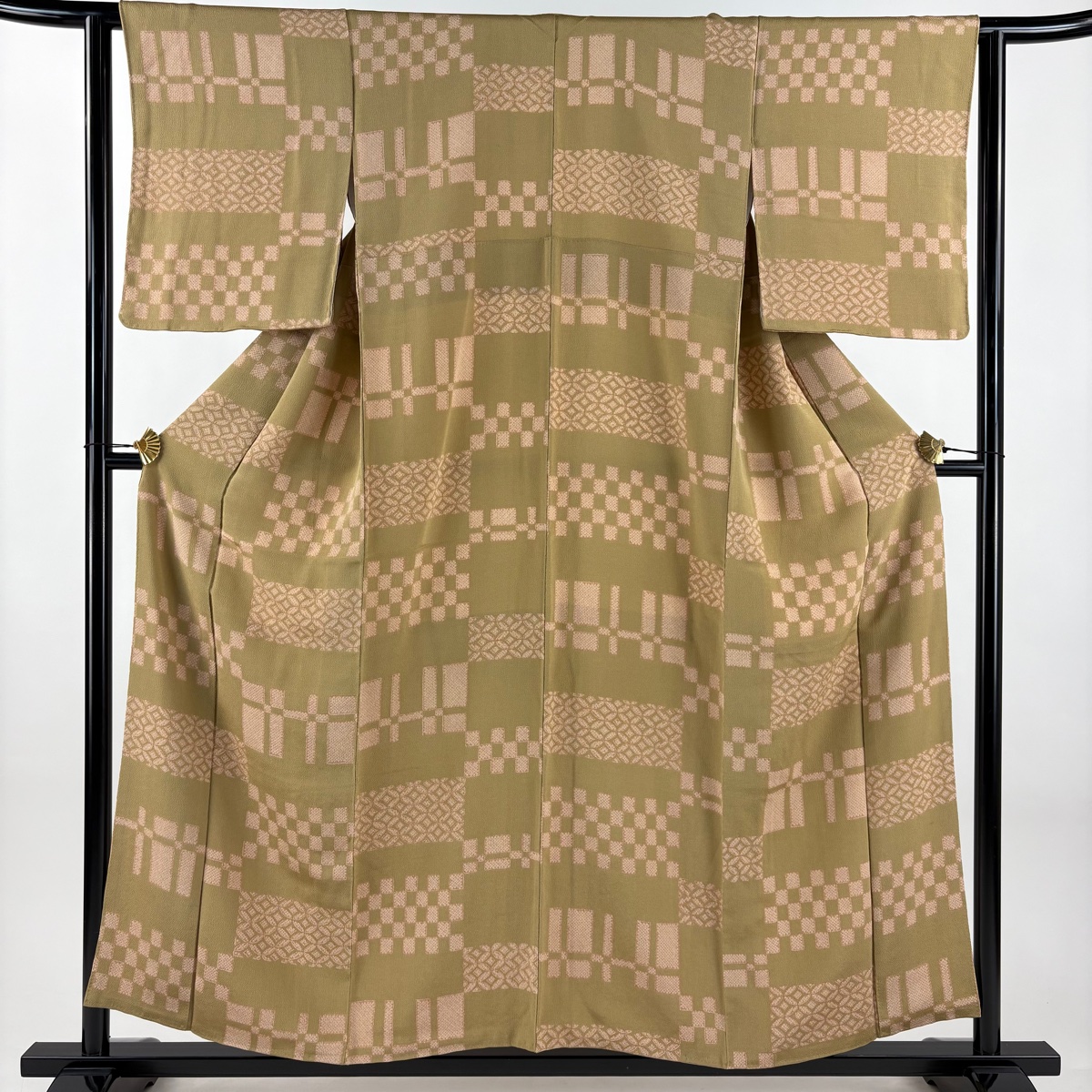 小紋 身丈155.5cm 裄丈62cm S 袷 七宝 市松 縮緬 黄土色 正絹 秀品 中古 在庫一掃