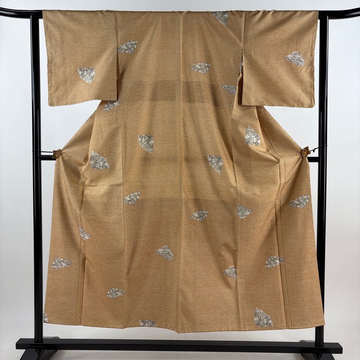 美品 小紋 身丈152cm 裄丈62cm S 袷 紬地 鳥 枝葉 薄茶色 正絹 秀品 中古 在庫一掃