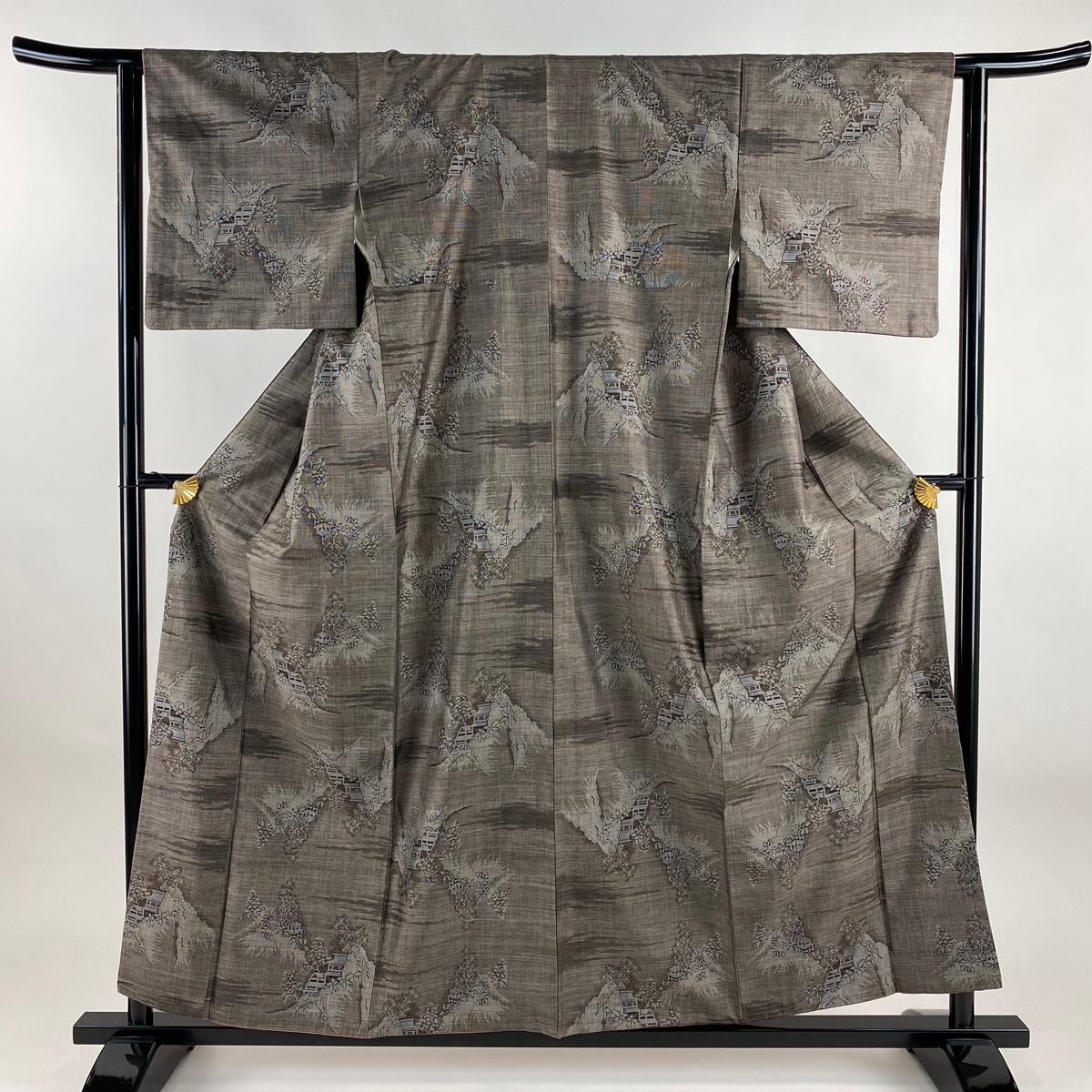 美品 紬 身丈158cm 裄丈63cm S 袷 建物 霞 焦茶色 正絹 秀品 中古 在庫一掃