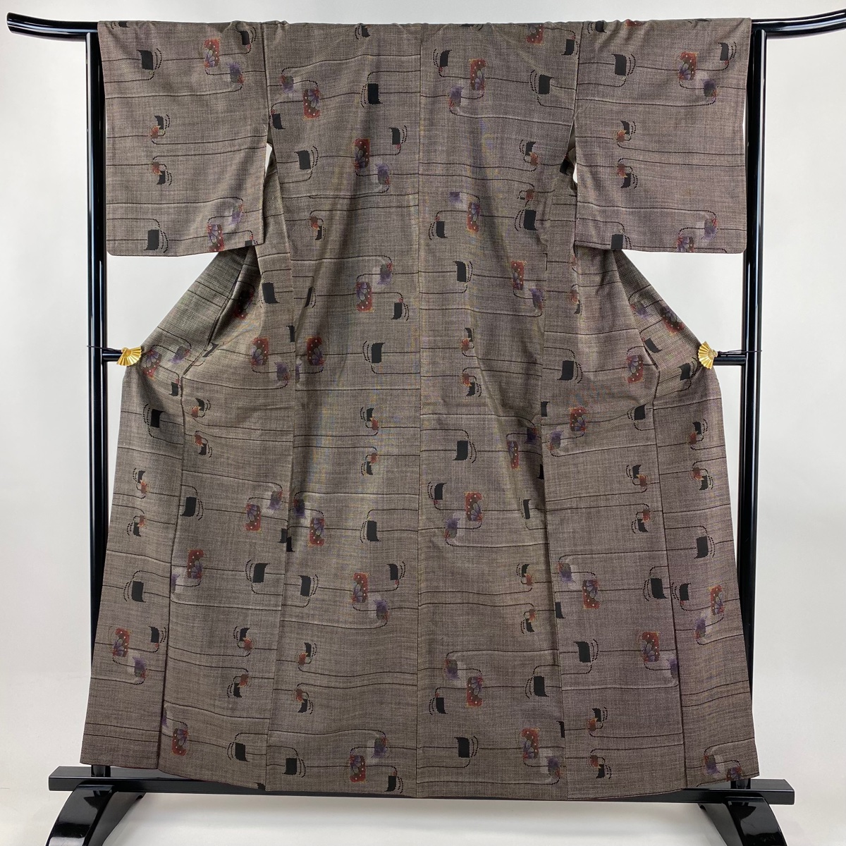 紬 身丈160cm 裄丈64cm M 袷 花 幾何学 焦茶色 正絹 秀品 中古 在庫一掃