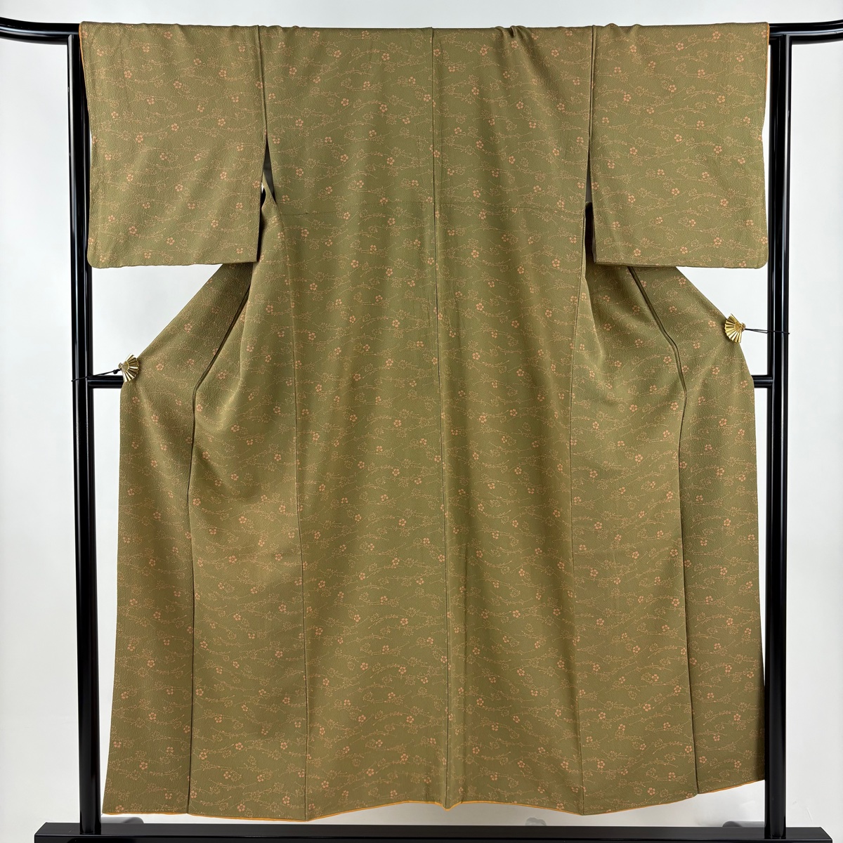 小紋 身丈151cm 裄丈65cm M 袷 桜 縮緬 茶緑色 正絹 秀品 中古 在庫一掃