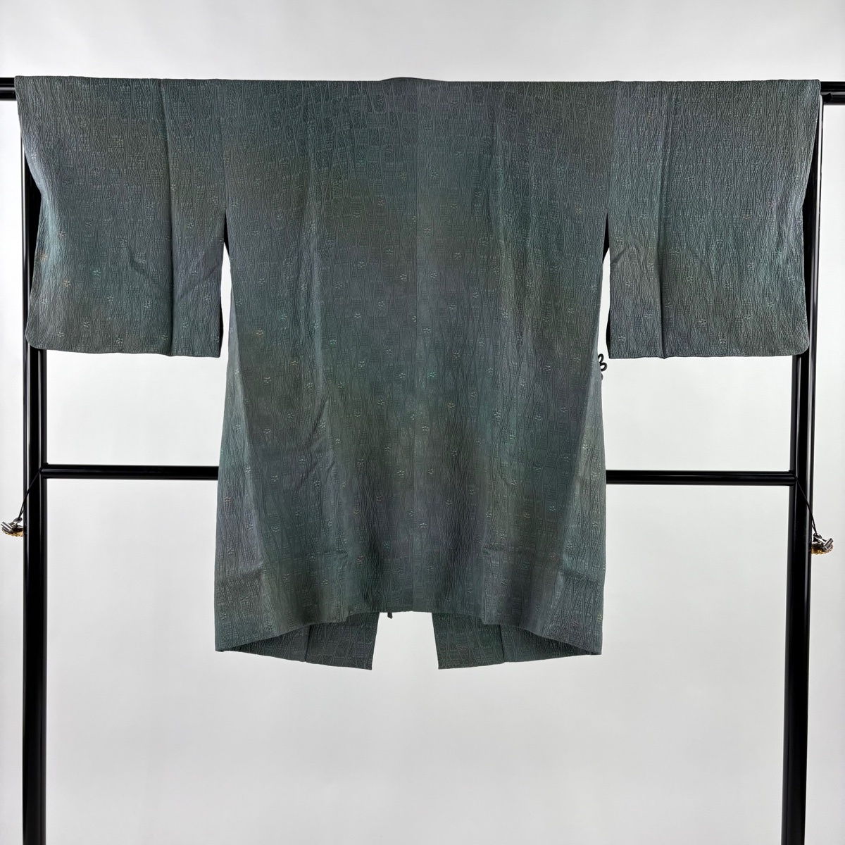 美品 道中着 身丈95cm 裄丈65.5cm M 和装コート 花 幾何学 刺繍 ぼかし 灰緑 正絹 秀品 中古