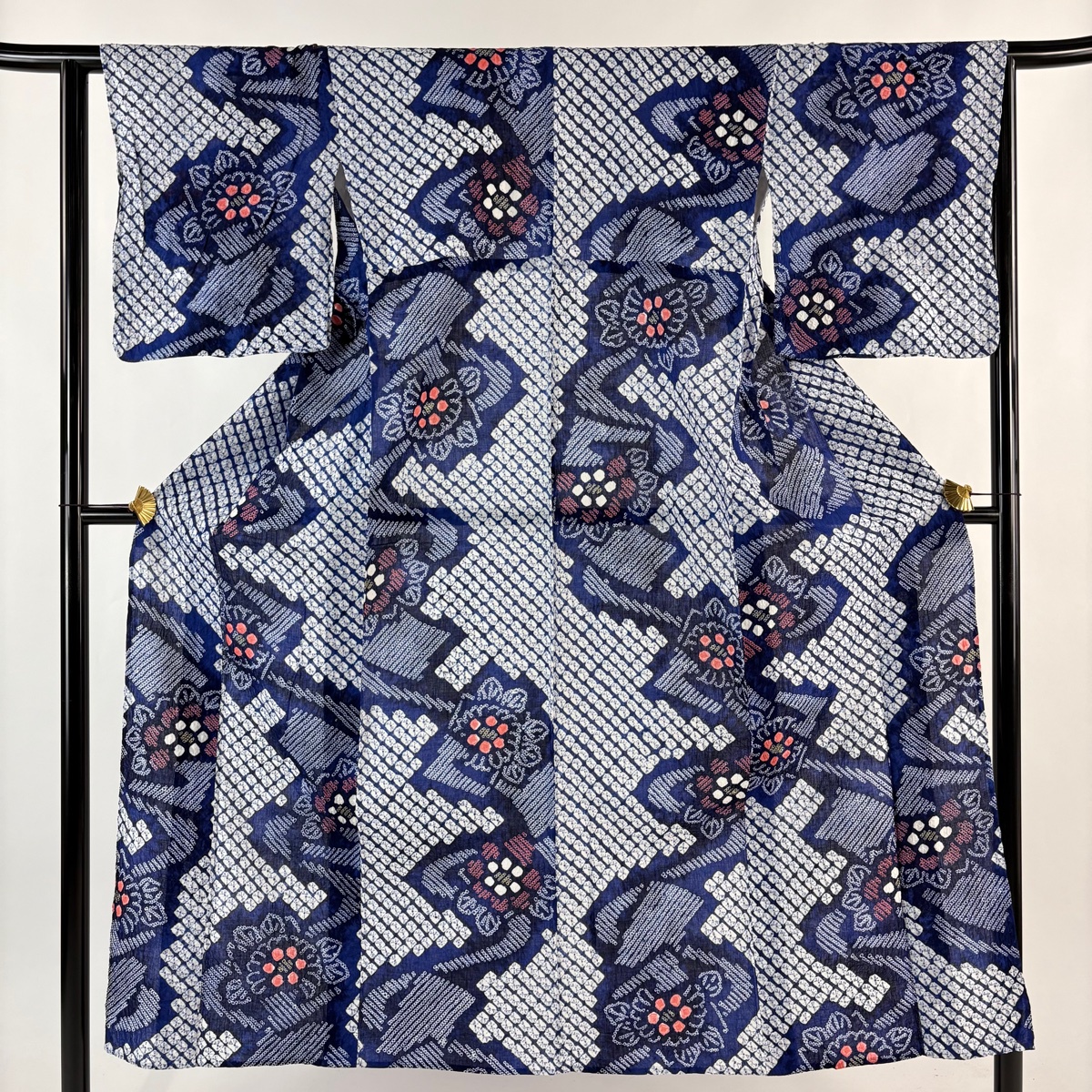 美品 浴衣 身丈148cm 裄丈62cm S 絞り浴衣 草花 流水 紺色 綿 名品 中古