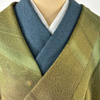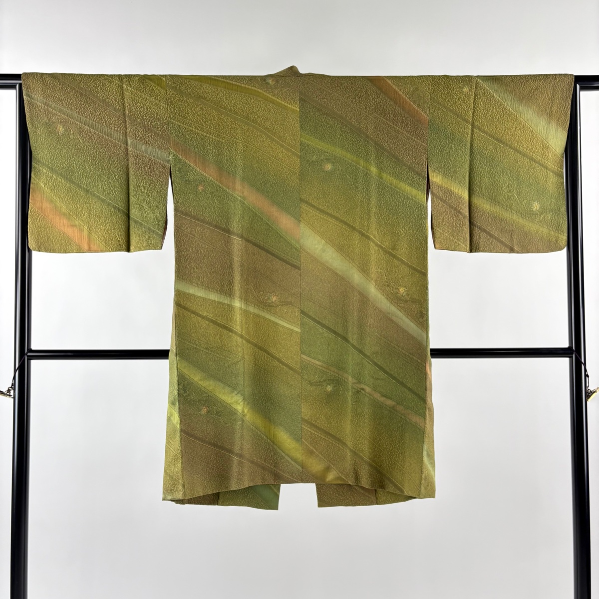 美品 道中着 身丈99cm 裄丈65cm M 和装コート 斜縞 花唐草 ぼかし 鶯色 正絹 秀品 中古