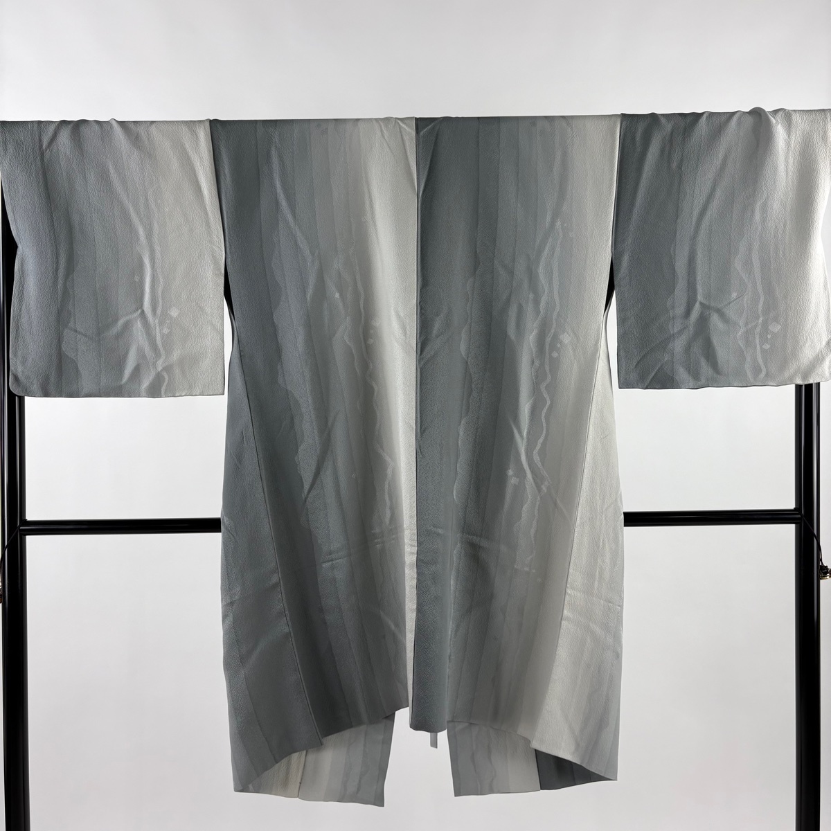 道中着 身丈100cm 裄丈69cm L 和装コート よろけ縞 地紋 灰色 正絹 秀品 中古