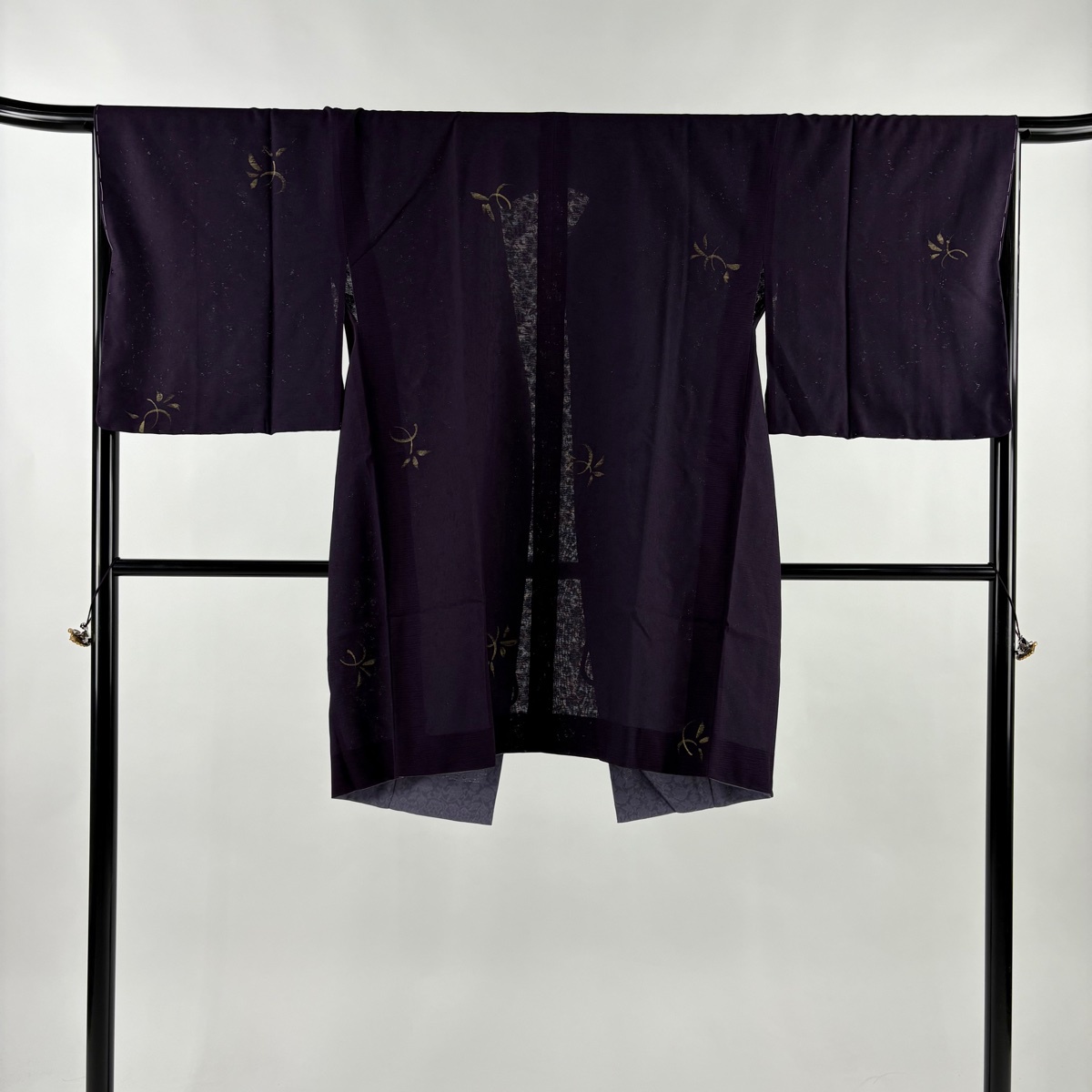 美品 道中着 身丈98cm 裄丈67.5cm L 和装コート 葉柄 金彩 濃紫 正絹 秀品 中古