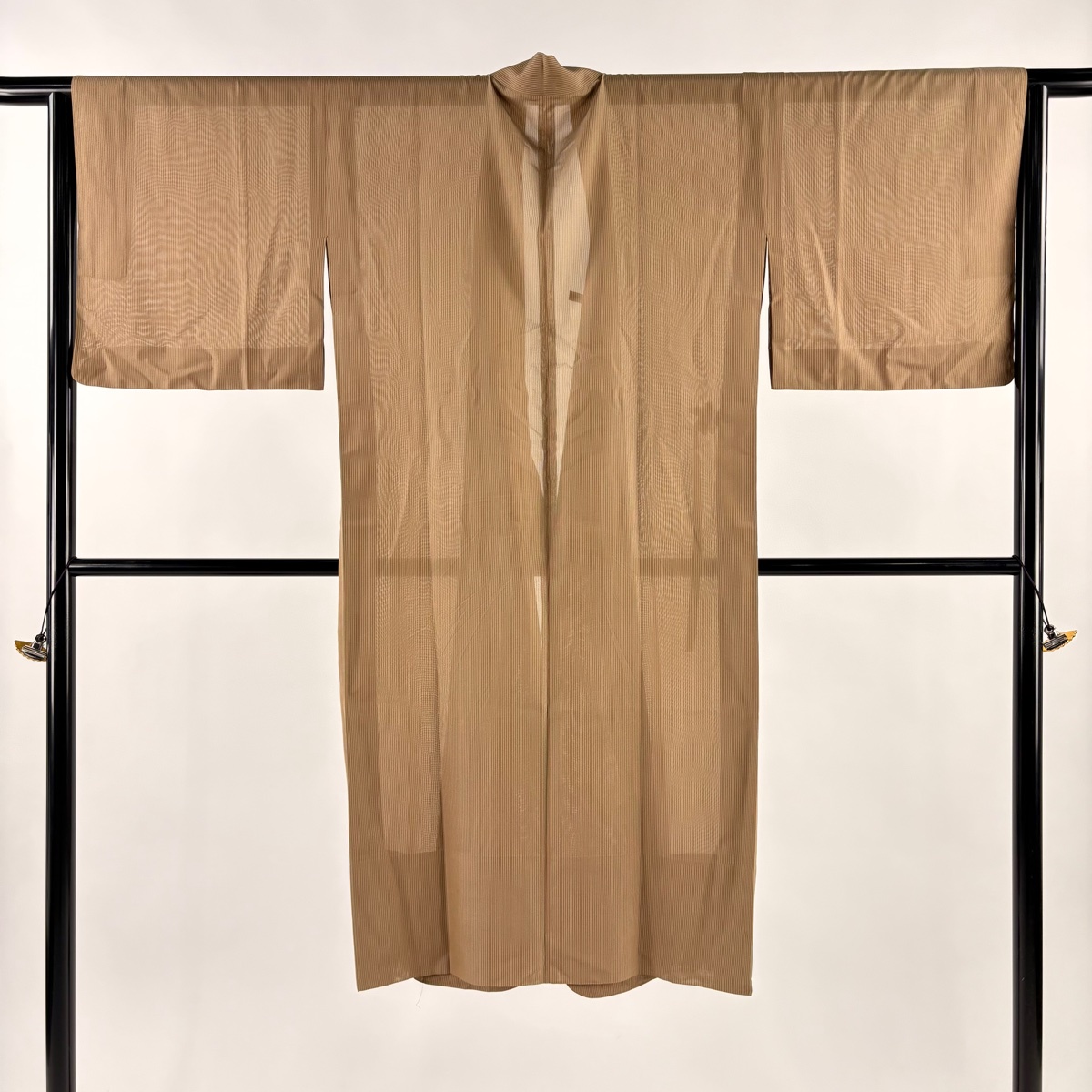 道中着 身丈119cm 裄丈65.5cm M 和装コート 着物衿 紬地 縦縞 薄茶色 正絹 名品 中古