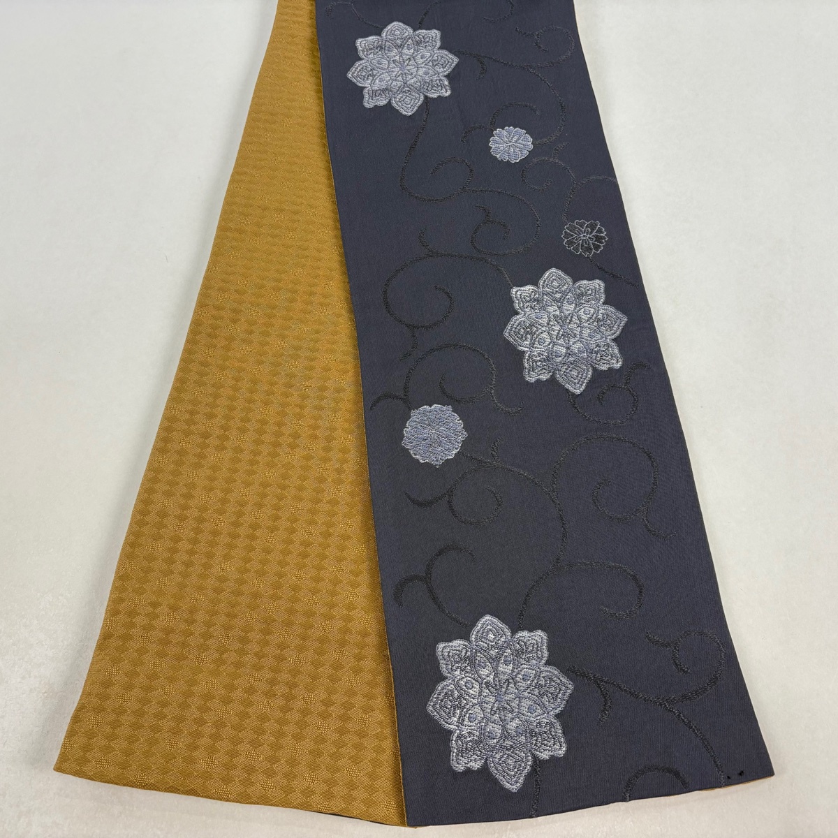 美品 半幅帯 優品 華文 唐草 灰色 化繊 中古